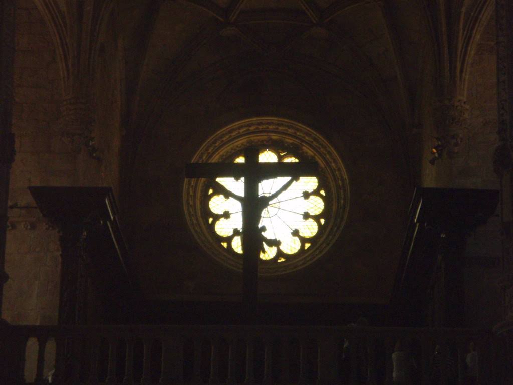 Intense, colorful light was pouring in through the round stained glass Rose Window that illuminated the dark, quiet interior. In the center of that light stood a giant, imposing crucifix. It felt as if the stained glass existed solely to be a radiant halo for the cross. The cross, with its back to the brilliant light, became a striking black silhouette casting a holy shadow on the floor, while mysterious beams of yellow and white light enveloped the surrounding ancient stones.