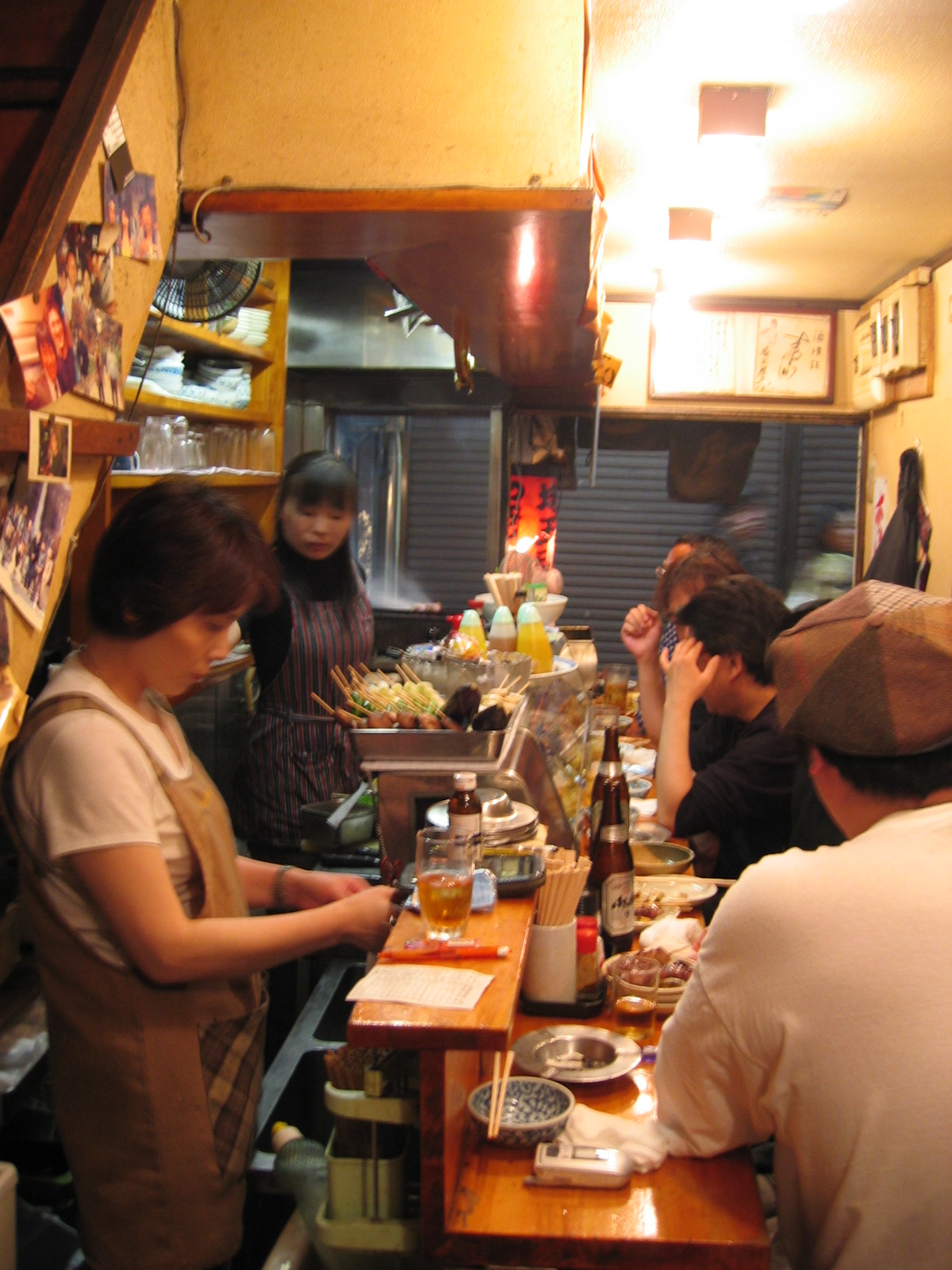 A weathered awning and a red lantern mark a tiny restaurant in the darkening alley. The smell of burning charcoal and a low hum of voices slip through the cracks of the sliding door. I carefully slide the door open and step inside.